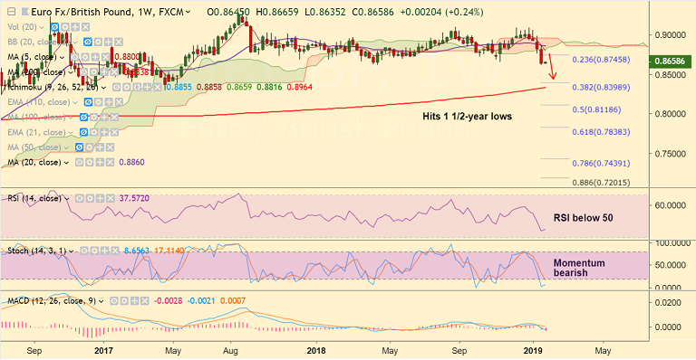 - EUR/GBP edges higher from 1-1/2 year lows at 0.8617, trades 0.29% higher on the day at 0.8663.