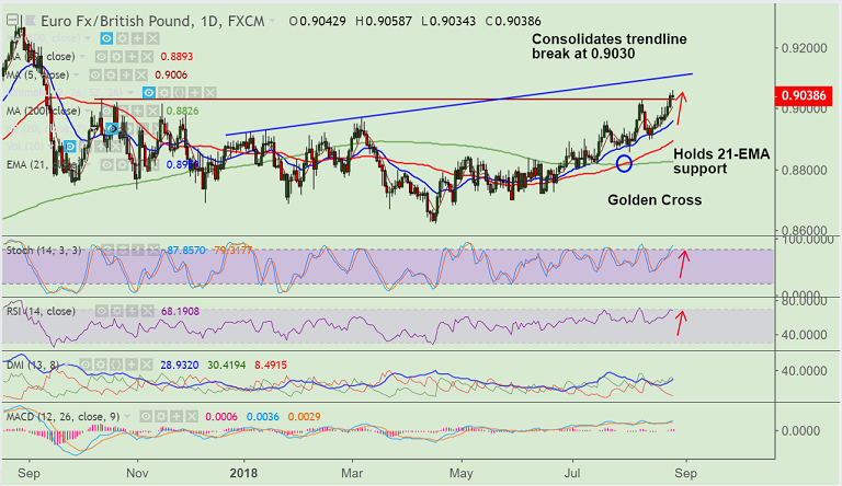 - Breakout at 0.9030 (Aug 9th high and strong trendline resistance) is liekly to take the pair higher to 0.91 levels.