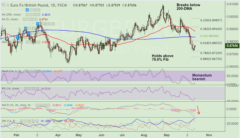 Support levels - 0.8754 (5-DMA), 0.8722 (78.6% Fib), 0.87, 0.8675 (88.6% Fib)