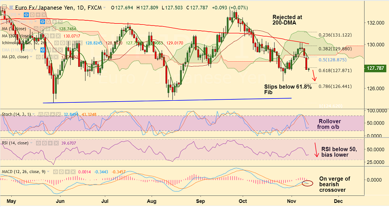 - On the flipside we see strong support at 127.35 (major trendline). Break below could see weakness till 126.63 (Oct 26 low)