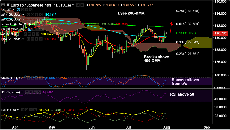 Support levels - 130.16 (100-DMA), 129.54 (38.2% Fib), 129.05 (cloud top)