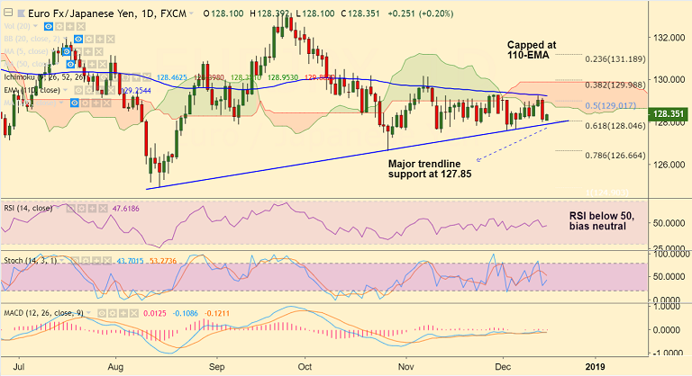 - The pair has been rejected at 110-EMA and has seen a steep fall on Friday's trade as poor data overshadowed easing concerns regarding Italy's budget.