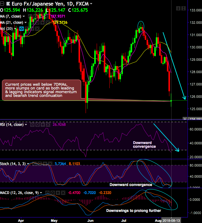EURJPY chart and candlestick pattern formed – Shooting star and hanging man patterns occur at 131.612 and 131.348 levels (refer daily chart) that plummet prices, consequently, the minor trend slides below DMAs. The same patterns have occurred even on monthly terms at 61.8% Fibonacci retracement levels, shooting star 132.336 and hanging man pattern at 135.157 levels (on monthly terms).