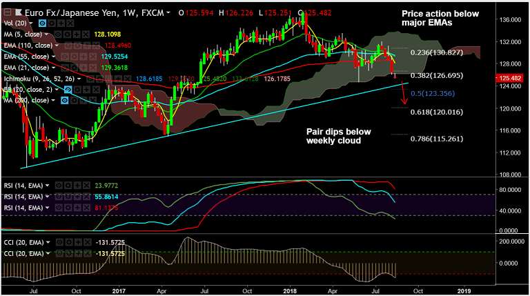 - The pair has slipped below weekly cloud and is on track to test strong trendline support at 124 levels.