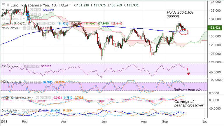 - The pair finds strong support at 200-DMA and we see weakness on break below. Scope then for test of 38.2% Fib at 129.88.