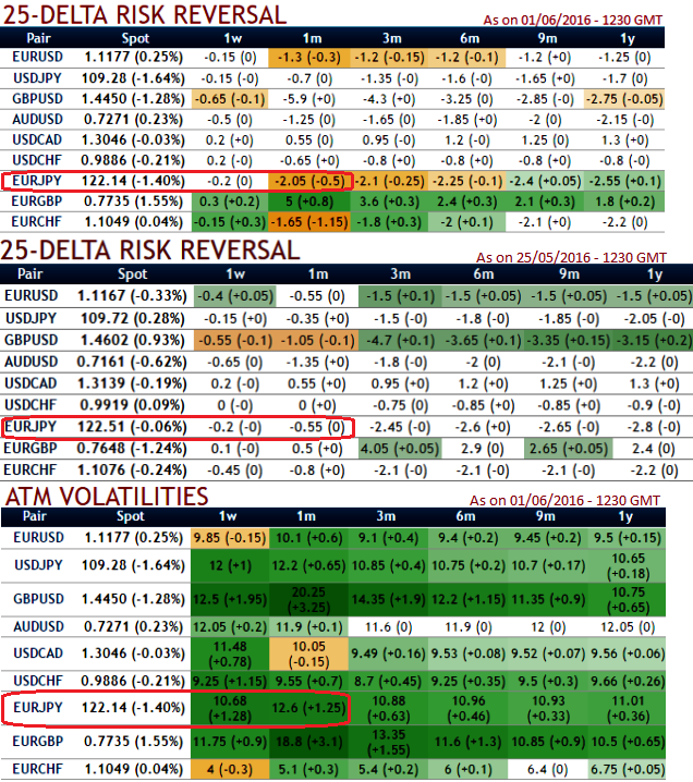 We could see that in nutshell showing IVs and delta risks reversals, while, the EUR/JPY 2m risk reversal is trading at extreme historical highs in favour of yen calls, close to the peak at -2.5 vols and within this tenor risk reversal strategy encompasses above stated risky events.