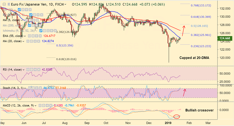 - EUR/JPY capped below 20-DMA resistance at 124.826, break above could see minor upside.