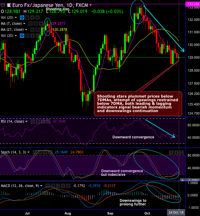 Please be noted that EURJPY has evidenced the sizeable price slumps upon below mentioned candlesticks and chart patterns. For now, the trend continues to be weaker.
