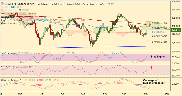 - The pair holds above 5-DMA support and eyes 110-EMA at 129.71 on bullish continuation. Weakness likely on slip below 5-DMA.