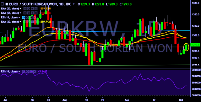 We prefer to take long position on EUR/KRW only above 1,295, stop loss at 1,288 and target of 1,315.
