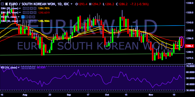 We prefer to take short position on EUR/KRW only below 1,283, stop loss at 1,295 and target of 1,258.
