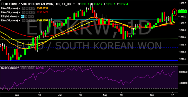 We prefer to take long position on EUR/KRW around 1,315, stop loss at 1,307 and target of 1,327.