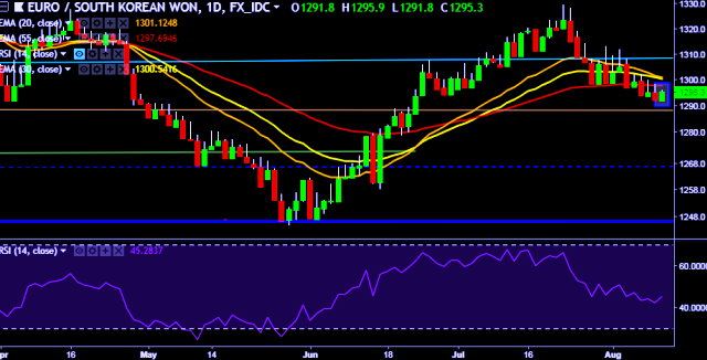 We prefer to take short position on EUR/KRW around 1,296, stop loss at 1,308 and target of 1,277.