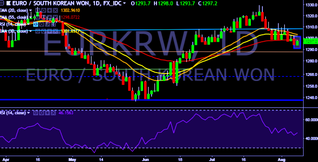 We prefer to take short position on EUR/KRW around 1,298, stop loss at 1,308 and target of 1,277.
