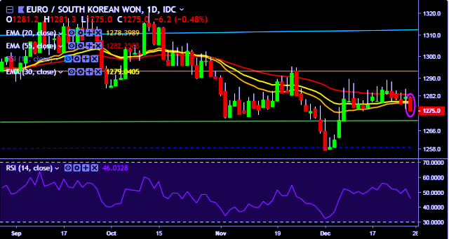 We prefer to take short position on EUR/KRW around 1,278, stop loss at 1,285 and target of 1,257/1,246.