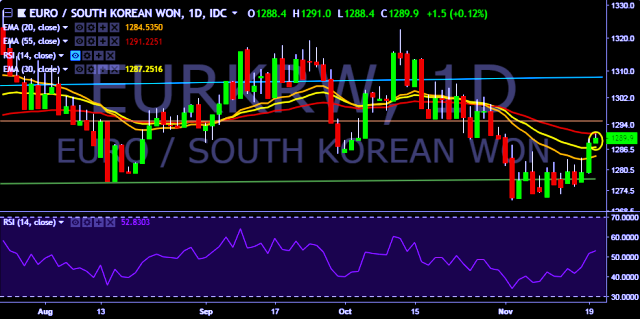 We prefer to take long position on EUR/KRW around 1,290, stop loss at 1,279 and target of 1,307/1,315.