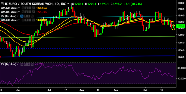 We prefer to take short position on EUR/KRW around 1,295, stop loss at 1,305 and target of 1,267.