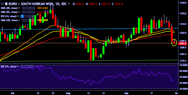 We prefer to take short position on EUR/KRW around 1,295, stop loss at 1,307 and target of 1,277.