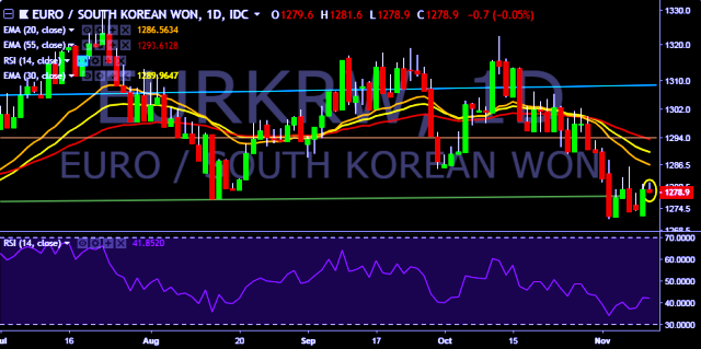 We prefer to take short position on EUR/KRW around 1,280, stop loss at 1,288 and target of 1,258/1,246.