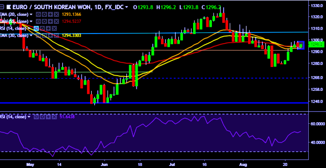 We prefer to take long position on EUR/KRW only above 1,298, stop loss at 1,290 and target of 1,315.