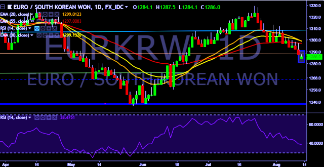 We prefer to take short position on EUR/KRW only below 1,284, stop loss at 1,298 and target of 1,277/1,258.