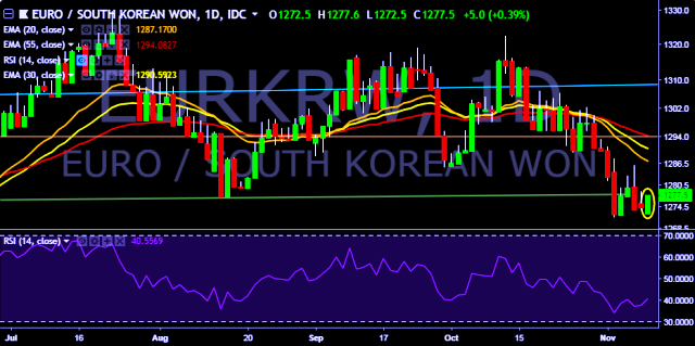 We prefer to take short position on EUR/KRW only below 1,272, stop loss at 1,288 and target of 1,258/1,246.