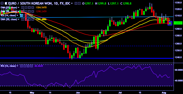 We prefer to take short position on EUR/KRW around 1,300, stop loss at 1,315 and target of 1,286.