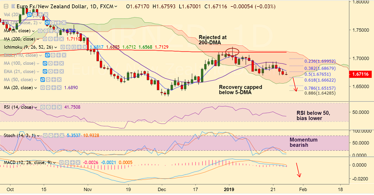 - EUR/NZD extends weakness post dovish ECB, recovery capped below 5-DMA at 1.6778, bias bearish.