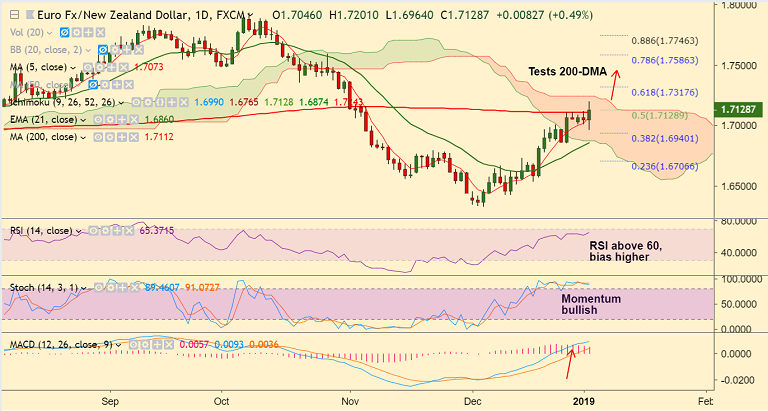 - EUR/NZD hovers around 200-DMA at 1.7112, break above to see further upside.