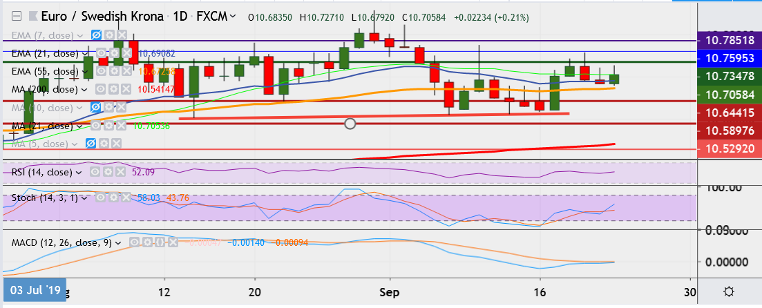 - On the lower side, support is seen at 10.6713 (55-EMA), break below could take it till 10.6420 (August 22 Low).