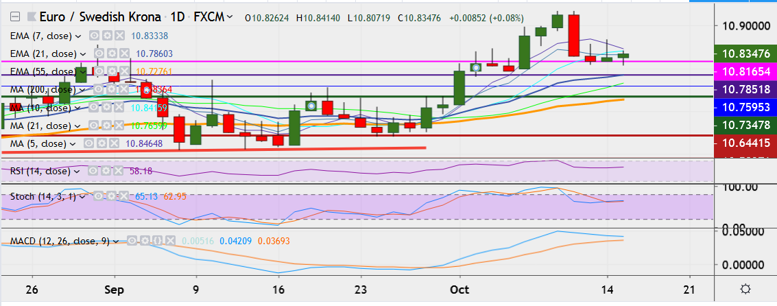 - EUR/SEK trades 0.05 percent up at 10.8305, having hit an all-time high of 10.9333 on Wednesday.