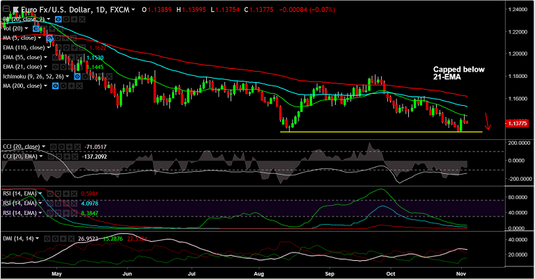 - The pair has been rejected at 21-EMA and we see scope for further weakness.