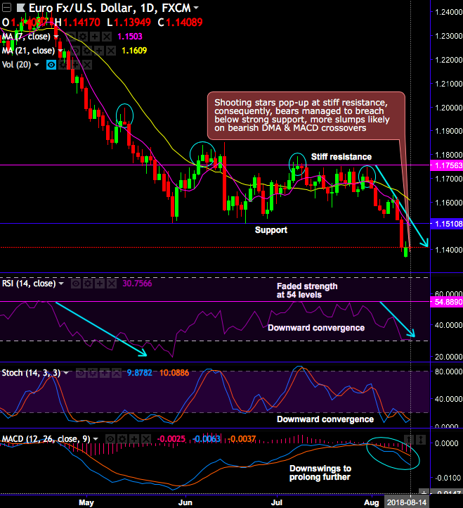 On a minor trend, shooting star patterns pop-up at stiff resistance (at 1.1756), consequently, bears managed to breach decisively below strong support (at 1.1519 levels) with stern bearish candle with big real body, for now, more slumps likely on bearish DMA & MACD crossovers.