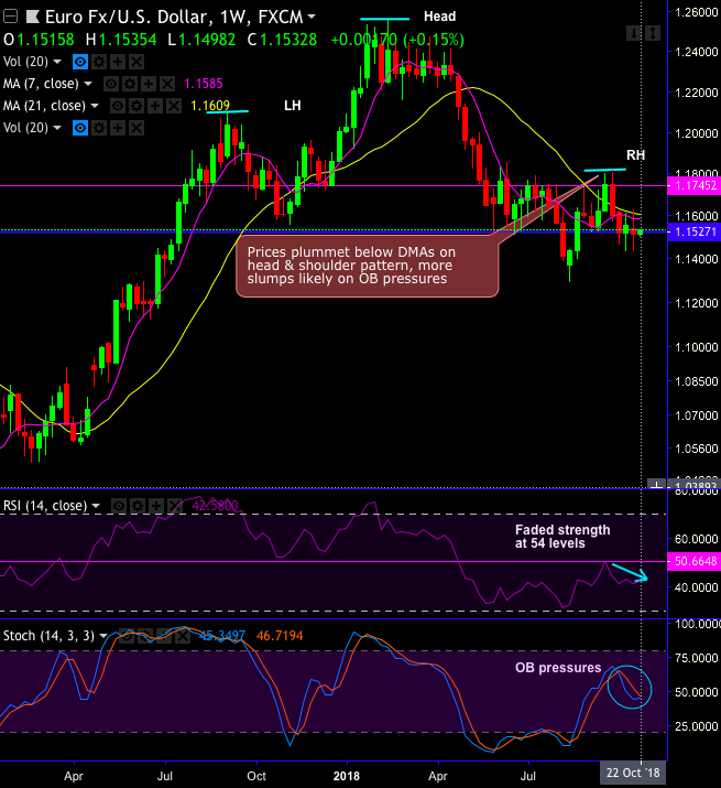 At spot reference: 1.1536 levels, contemplating above technical rationale, one can execute tunnel spread options strategy. Such exotic option with upper strikes at 1.1585 and lower strikes at 1.1432 levels have been unbiased strategy but to favor slightly the bearish sentiments.