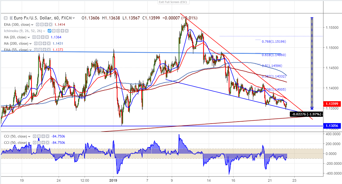 EURUSD continues to trade lower for 9th consecutive day. It has lost more than 200 pips from the high on account of dovish ECB and broad based USD buying. The spread between USD and German 2 year has rose to 320 basis point highest level since Dec 21st . The pair hits low of 1.13459 and is currently trading around 1.13617.