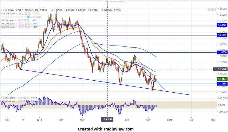 EUR/USD has shown a minor jump of 50 pips yesterday and was consolidating as US markets shut yesterday for Thanksgiving day. Euro slight jump was mainly due to Brexit optimism. The ECB meetings doesnt have much impact as the policy makers are planning to exit QE by Dec 2019 and slightly worried about global growth and slowing inflation due to declining crude. The spread between German and Italy has reduced to 308 basis point from 335 basis point. Markets eye European countries flash PMI for further direction. It is currently trading around 1.14128.