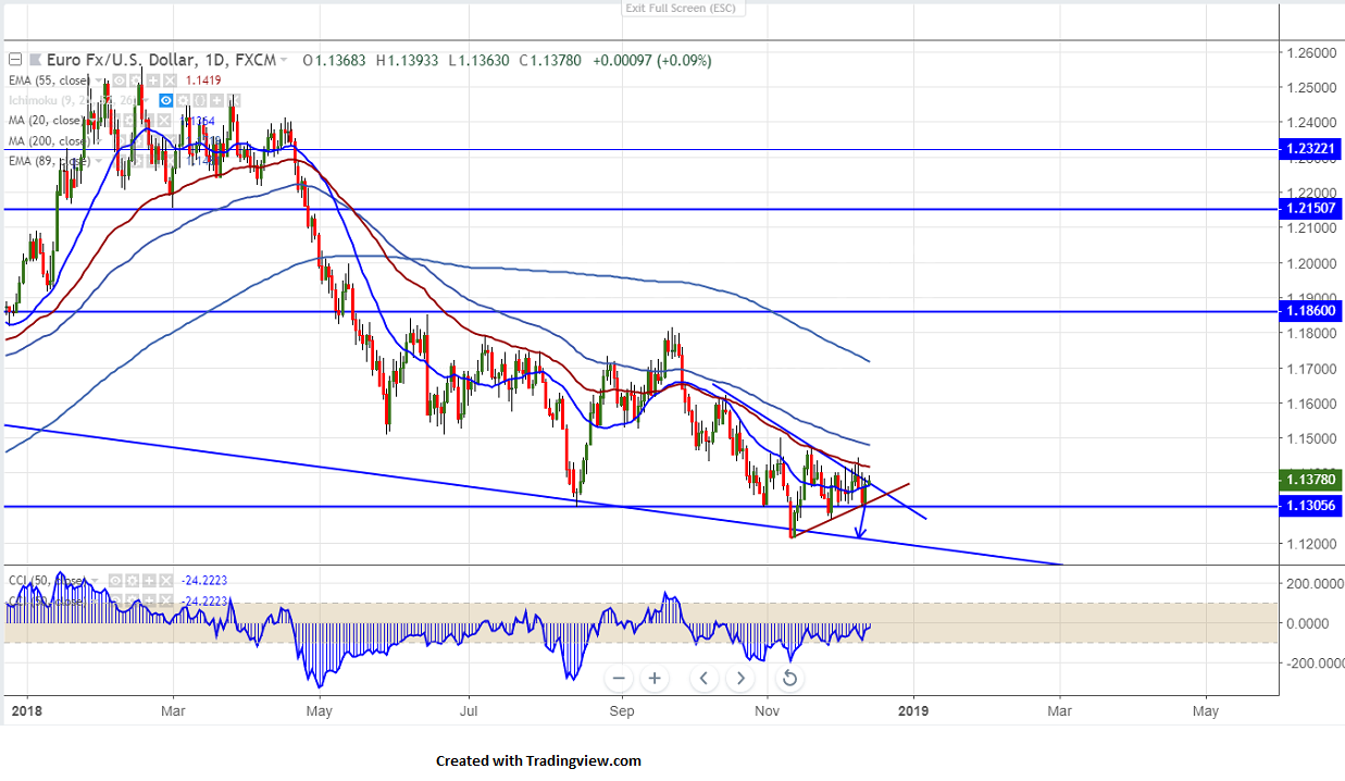 EUR/USD has once again taken support near 1.1300 level and shown a minor recovery on US-China trade deal hopes and easing Italy budget deficit problem. The spread between Italy and German yield declined to 20 basis point from 330 on account progress in Italy and European Commission. Markets eye ECB monetary policy meeting to be held today for further direction. ECB is expected to quit the QE program by this year end and also to publish new growth and inflation forecasts. Any hawkish policy by Draghi will make the Euro to trade higher and will reach 1.1500 level. It is currently trading around 1.13790.