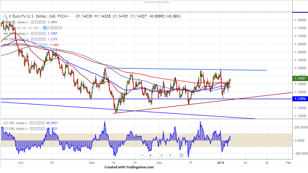 EURUSD has once again recovered after showing a minor dip till 1.13450. US Non farm payoll came better than expected on Friday. US economy has added 31300 jobs in the month of Dec compared to forecast of 182000 and unemployment rate is at 3.9% increased from 3.7%. The increased optimism in US and China trade talks and dovish Fed is putting pressure on US dollar. It hits intraday high of 1.14300 and is currently trading around 1.14178.
