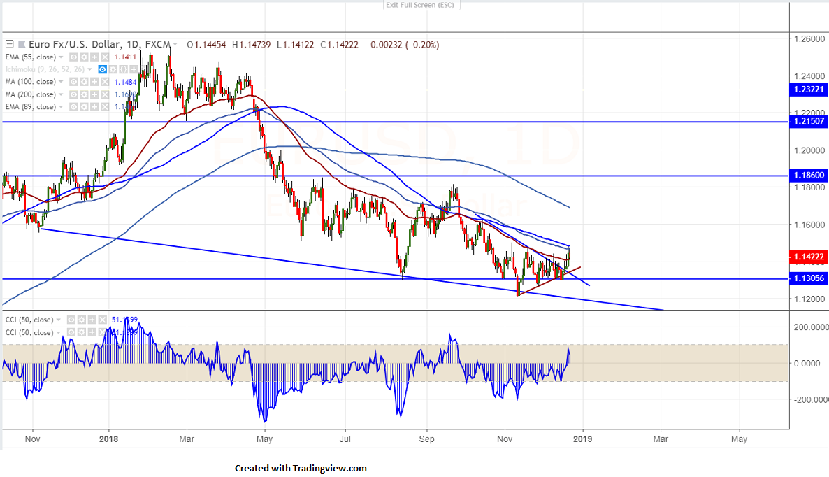 EURUSD pares most of its gains made after Fed policy and lost nearly 80 pips. The slight dovish Fed, yield curve inversion and US government shutdown is the main reason for jump in Euro. The pair hits high of 1.14858 and is currently trading around 1.14240.
