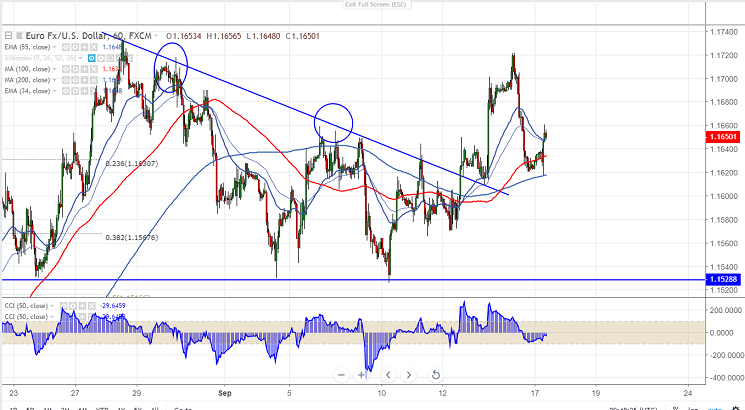 EURUSD has lost more than 100 pips from the high of 1.17212 made on Friday. The pair decline due to Trump trade tariff on China. US President Trump is planning to impose further tariffs of $200 billion on Chinese goods today according to wall street journal. The pair hits low of 1.16179 and is currently trading around 1.16450.