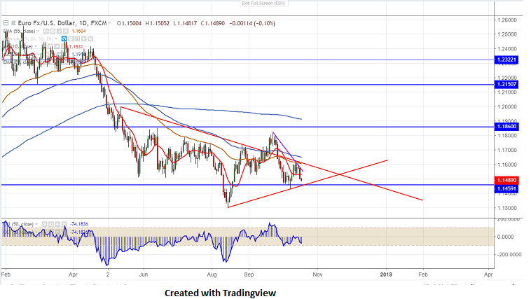 EURUSD has pared most of its gains made this week. The pair hits high of 1.16212 on Oct 16th 2018 and declined more than 100 pips yesterday after Fed meeting minutes. It is currently trading around 1.14849.