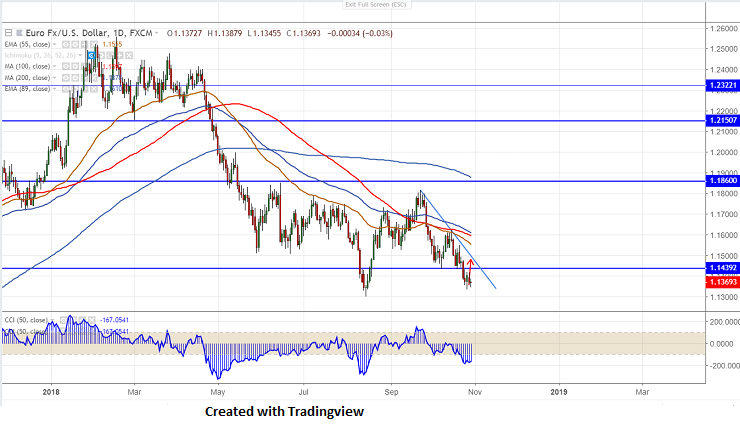 EUR/USD continuing its weakness for second consecutive days and broken below 1.13500 level. Euro-Zone GDP came at 0.2% in Q3 compared to forecast of 0.4%. The pair hits low of 1.13455 at the time of writing and is currently trading around 1.13720.Markets eye US Consumer board consumer confidence.