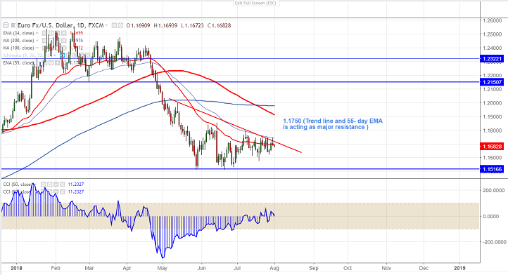 On the higher side, near term resistance is around 1.1750 (trend line and 55- day EMA) and any break above will take the pair to next level till 1.1800/1.18515.