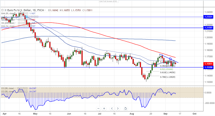 EUR/USD is consolidating between narrow range between 1.1530 and 1.16589 for past one week. The pair gained slightly yesterday after China has Said it will seek permission from WTO to impose sanctions of $7 billion on US goods and positive news on Brexit. But markets eye European Central Bank monetary policy meeting tomorrow for further direction. ECB is expected to keep rates on hold and to lower the growth outlook on global demand. US CPI data which is to be released yesterday have more impact on US dollar.