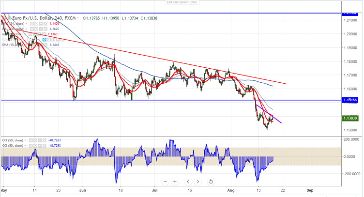 EURUSD is consolidating after hitting low of 1.13011. The pair recovered till 1.14069 and started to decline from that level. Euro’s decline was slightly halted as trade war tension between US and China eases. US and China is planning to have talks by end of third week of Aug.