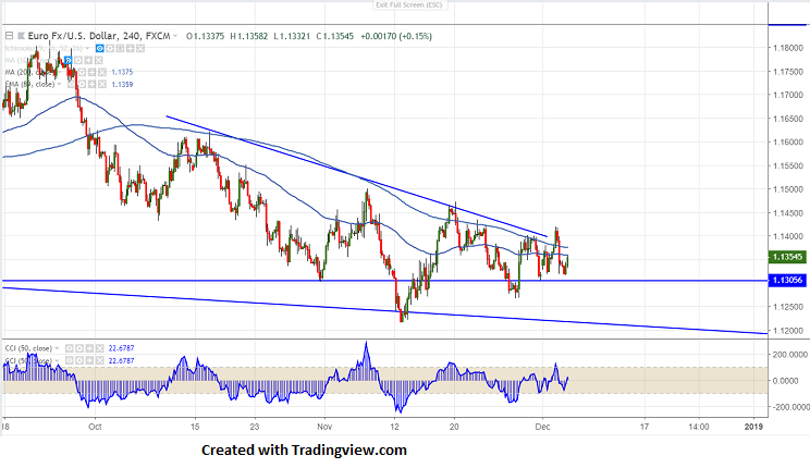 EUR/USD unable to maintain gains made after US and China trade truce.The pair hits high of 1.14183 and lost nearly 100 pips from that level. The USD was gaining against all majors as optimism on trade talks was faded and US stock markets has shown a huge sell-off of more than 3% yesterday. But declining US bond yield to support EURUSD at lower levels. US 2- year yield surpasses 5 year for the first time in 10 years. The spread between German and Italy bond yield has increased to 288 basis point from 270 basis point. US 10-year yield drops more than 5% and has closed below 200-day MA.