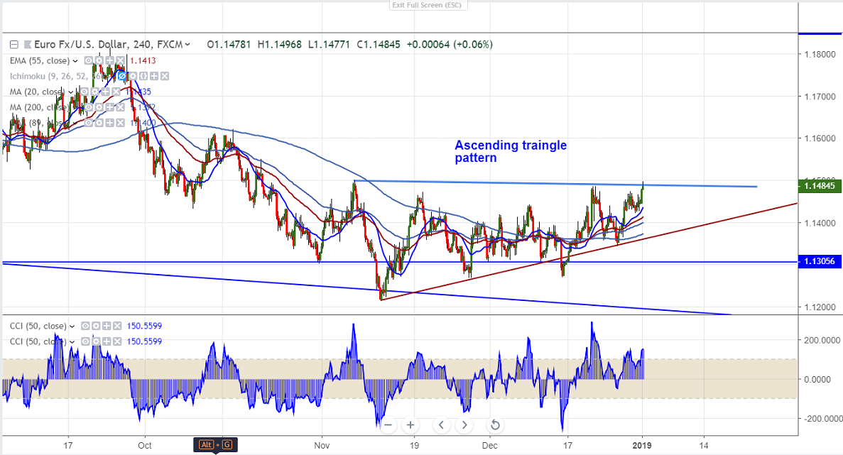 EUR/USD trades higher and jumped more than 50 pips for the day .The decline in US 10 year yield and slight dovish Fed policy is supporting Euro. The pair hits high of 1.14969 and is currently trading around 1.14830.