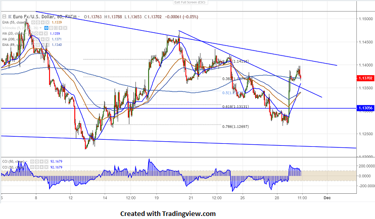 EURUSD has recovered sharply more than 100 pips after yesterday Fed Chairman Powell speech. Fed Chairman said that rates are “just below” neutral which fuelled hopes that Fed may close or pause interest rate tightening cycle. The pair hits high of 1.13976. It is currently trading around 1.13700.