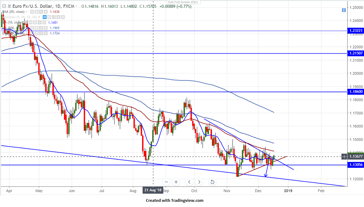 EUR/USD has pared some of its losses made on Friday and jumped more than 100 pips ahead of US Fed policy Fed is expected to hike interest rates by 25 basis point and to be hawkish. German IFO data released today came slightly weaker than expected. It came at 101 points compared to forecast of 101.80 level.Italy and European Commission are still negotiating over budget issues. The spread between Italy and German yield declined to 270 basis point from 330. Markets eye US fed monetary policy for further direction. It is currently trading around 1.13374.