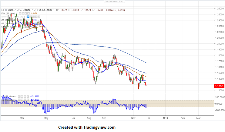 EURUSD is trading lower for 3rd consecutive day. The pair has lost more than 100 pips from high of 1.13837 made on Nov 26th 2018. The strength in USD was mainly due to US and China trade tensions US President Trump and Chinese PM scheduled to meet on Sat of this week in Buneos Aires at G20 summit. Markets eye US Fed Powell speech today for further direction. The pair hits low of 1.12733 for the intraday and is currently trading around 1.12753.